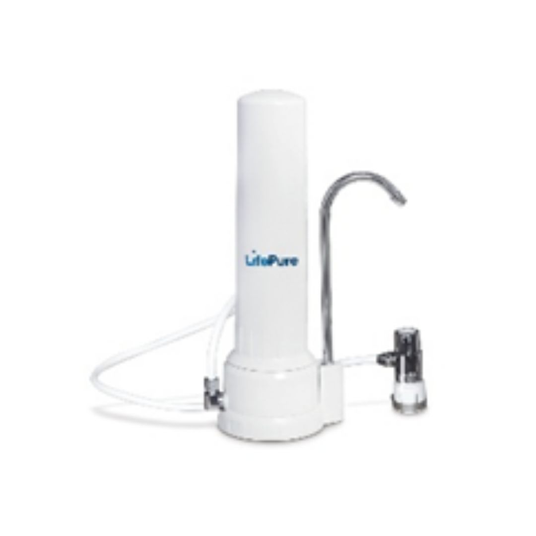 Purificador LIFE PURE HOME INOX sobre mesada con filtro. Carcasa de acero inoxidable. Filtro interno de cerámica y carbón. Se cambia el filtro de 8 a 10 meses.